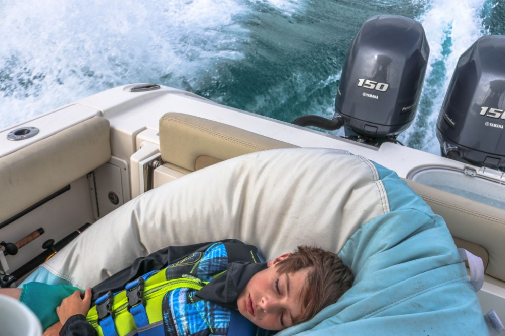 Cas informed me that the boat seemed to be sitting kinda low in the water (she said sinking, but I am toning it back a little). It had been raining a bunch, but the boat has a bilge pump, hmmm, that warrants checking out. Part of the mind-numbing boat check out process was to check the bilge pump, so I know it works. After the rain I go to check it out. Yep, its full of water. Ok kiddies, Boat Design 101. Your bilge pump should be connected to the battery, period, end of conversation. This one was wired through the battery switch, that the boat rental company specifically told me to “turn off or the battery will be dead”. Yeah, dead because it was keeping the boat afloat. Now you might be like me right now and thinking, didn’t you have a center console? It should be self-bailing and no amount of rain in a 24 hour period is going to sink it. Boat Design 201: water should not get into the bilge unless you have a hole in your hull. Don’t put one there on purpose. This boat had an access panel in the stern (the back for you landlubbers). It was not water tight and the weight of the rain that ran right into that hole (that should have been water tight) added to the weight of that big motor (that made the boat go so fast) and managed to put the access hole below “sea level”. If you are keeping up, you now know that water was flowing from the ocean into the boat. Not good… I would rename this boat the “Event Horizon”, since that is where we were at that very moment. 30 minutes of manual bailing and running the bilge pump brought us back from the edge of the black hole and put us back in business. Dead battery or not, the battery switch would remain on for the rest of the trip. Add this to the ever-growing list of “The Cas prophesies”. Not sure how she does it, but I have learned to listen.