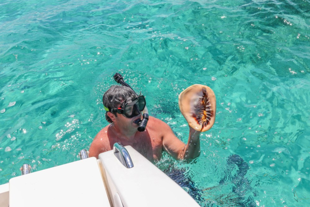 Down near Pelican Cay, I found the biggest Helmet I have ever seen. Unfortunately, for me he was still living, so I put him back on the bottom to grow some more. Also there, I had a close encounter with another stingray. This time I wasn’t paying attention and stepped on one. Either I got lucky, he felt pity, or both, because my brain couldn’t process what was going on for several seconds until he wiggled out from under my foot. Then the Boy Scout Boat pulled up and dumped 800 Scouts out, which was our cue to head on south. We hit Pete’s Pub for the usual great food and returned to the house to do some more chores.