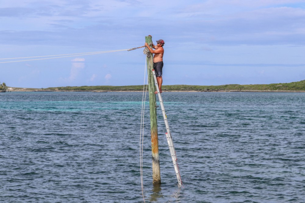 I decided to replace our dolphin line with a new line, new chains and cleat. Now this was supposed to be my fun project. What’s not fun about carrying an extension ladder out to chest deep water and climbing up a 25’ piling. Well at least I figured if I fell, I would land in the water. Boy did I get some strange looks by passing boats. Especially ones that had a boat in front of them, because the first boat’s wake would hit my ladder and the piling and make me rock back and forth causing me to have to do the “mechanical bull” ride with one arm wrapped around the piling and the other with my socket wrench waiving back and forth over my head to maintain balance. Well at least now you know the story. I am sure there are people somewhere that have already told their friends and family about the crazy guy in Abaco riding the piling while singing “ Hey Hopetown… throw your rope down”. Yes, that is the only part of the song I can remember, so I just sing that over and over. Once I got the hardware swapped, I pulled the rope through and was saved by a good Samaritan who was renting the house next door (thank you kind sir). 200 foot of 5/8”, waterlogged rope is a lot heavier than it looks, so he helped me hold it while I tied everything up. Before he grabbed it, I was pondering how far it was going to launch me if I lost my footing on the dock. As I was making my 14th trip from the piling to the dock, crunch, sea urchin, ouch. I am now pretty proficient at removing sea urchin spines. You probably don’t want me doing it though, because my strategy was to wait until they got infected, which would give away their position and dig them out with a needle. They are much harder to remove than splinters, because they go in at a 90-degree angle to the surface and they go in deep! Anyway, I was lucky because they all were not directly on the pressure points of my foot, so I could still walk.