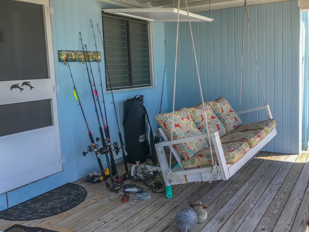 I reused the old couch (that was homemade out of 2×4’s) and turned it in an awesome porch swing. You are going to love it. We instantly started hanging out on the deck more. Nothing better than swinging in the shade, watching the sailboats go by.
